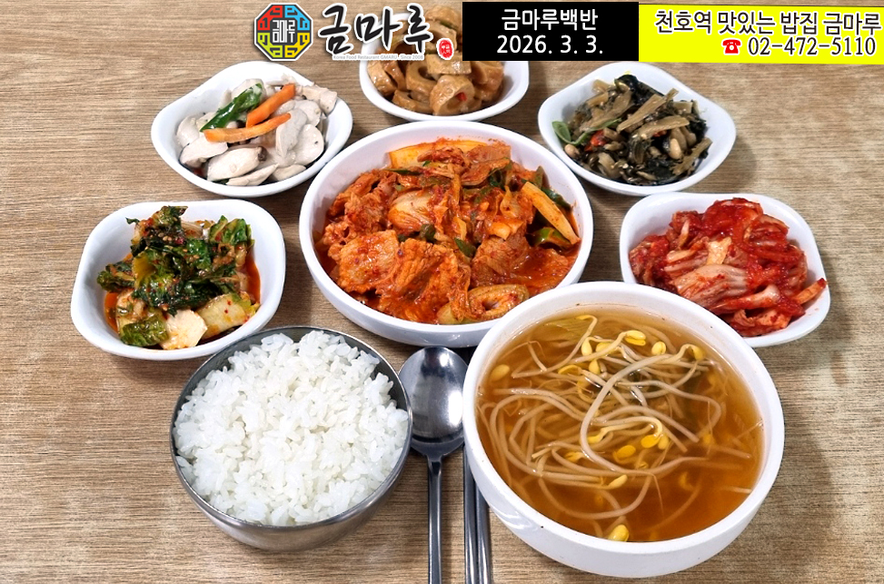 | [천호역 금마루 식당] 2026년 3월 5일 목요일 맛있는 금마루 백반 메뉴 안내 (0) | 2026.03.05 |