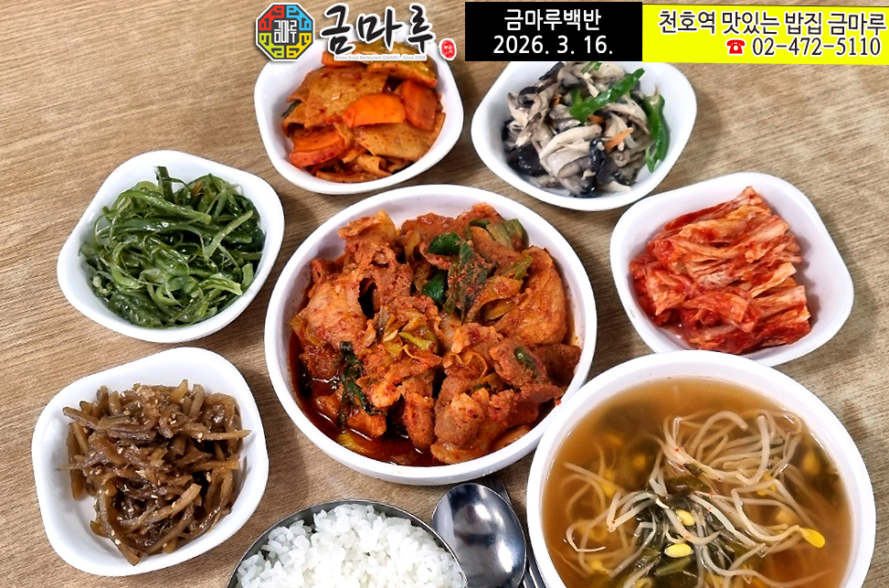 | [천호역 금마루 식당] 2026년 3월 10일 화요일 맛있는 금마루 백반 메뉴 안내 (0) | 2026.03.10 |