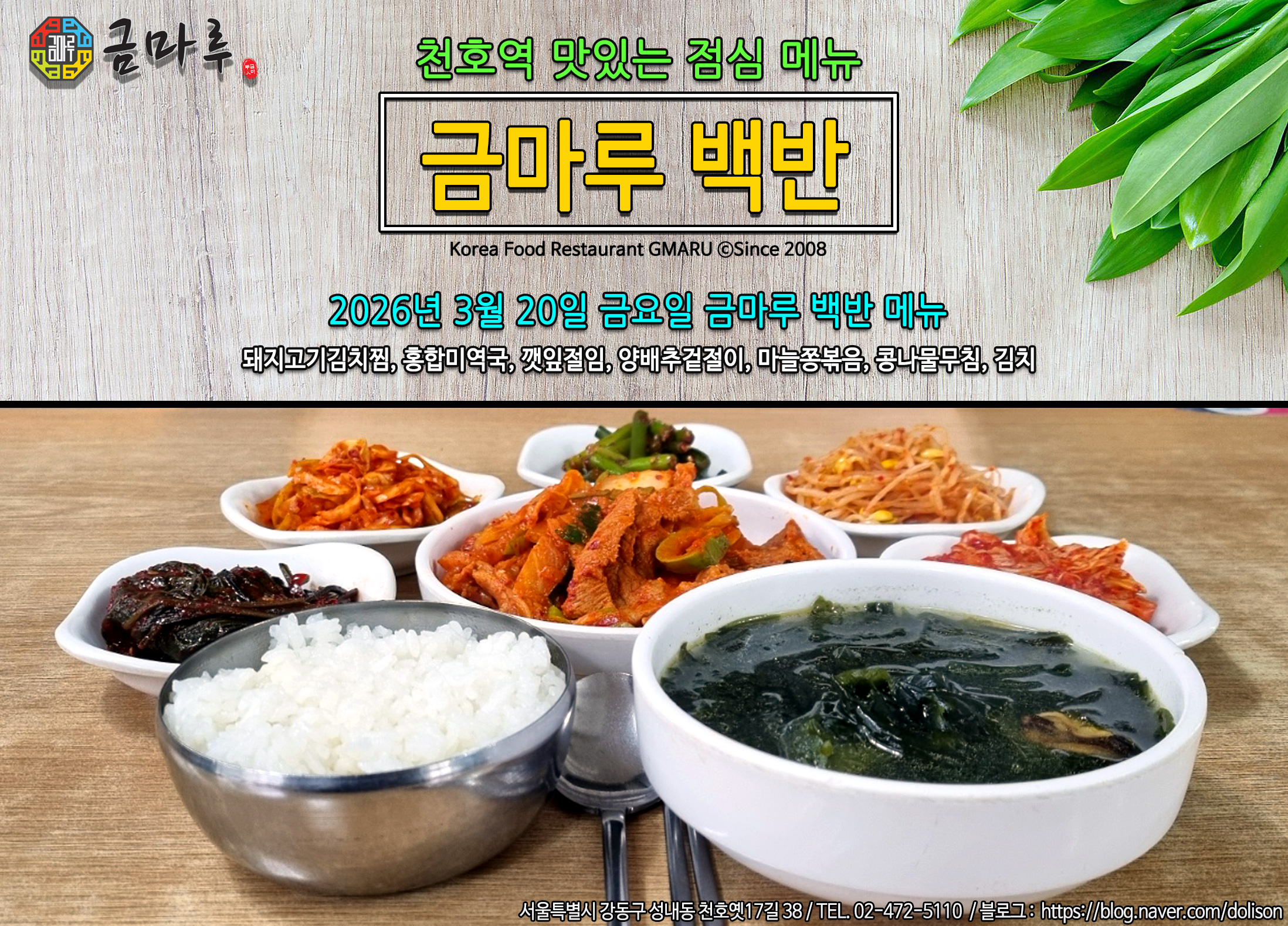 < 2026년 3월 20일 금요일 천호역 금마루 백반 메뉴 구성 >