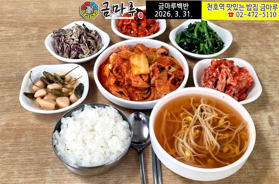 | [천호역 맛집] 금마루 식당 : 3월 30일(월) 정성 가득 제육볶음 백반 메뉴 🍱 (0) | 2026.03.30 |