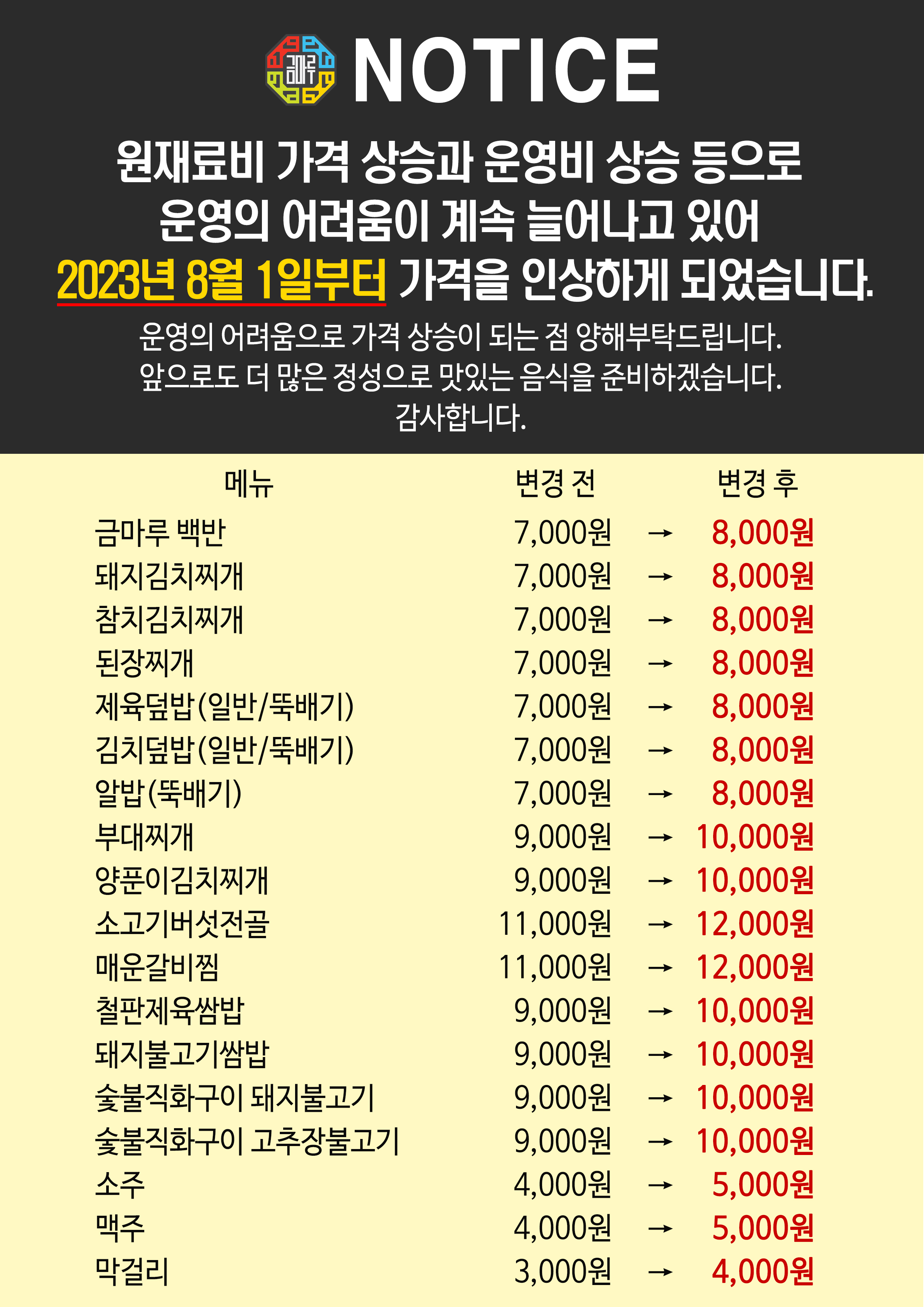 2023년 8월 1일 부터 금마루 식당 메뉴 가격 인상됩니다.